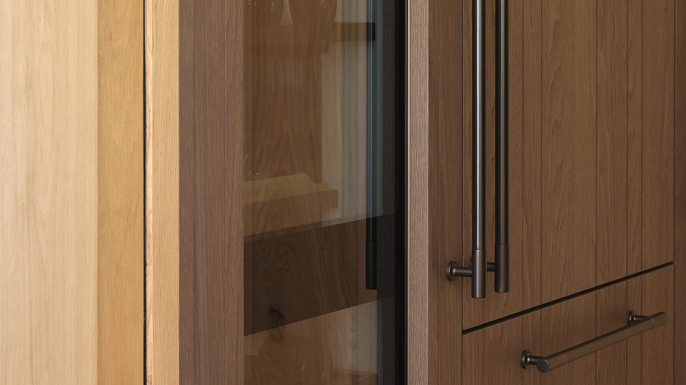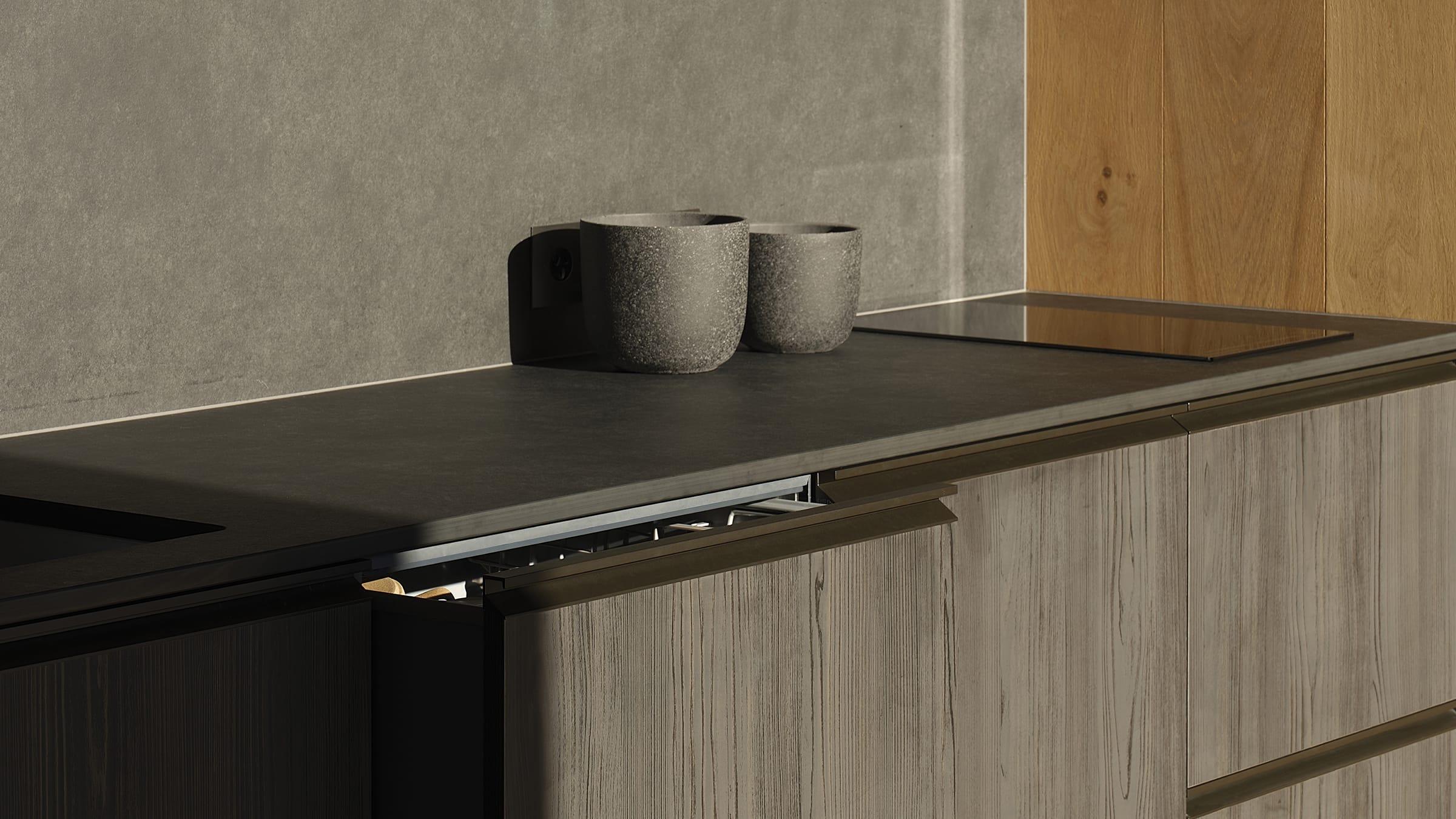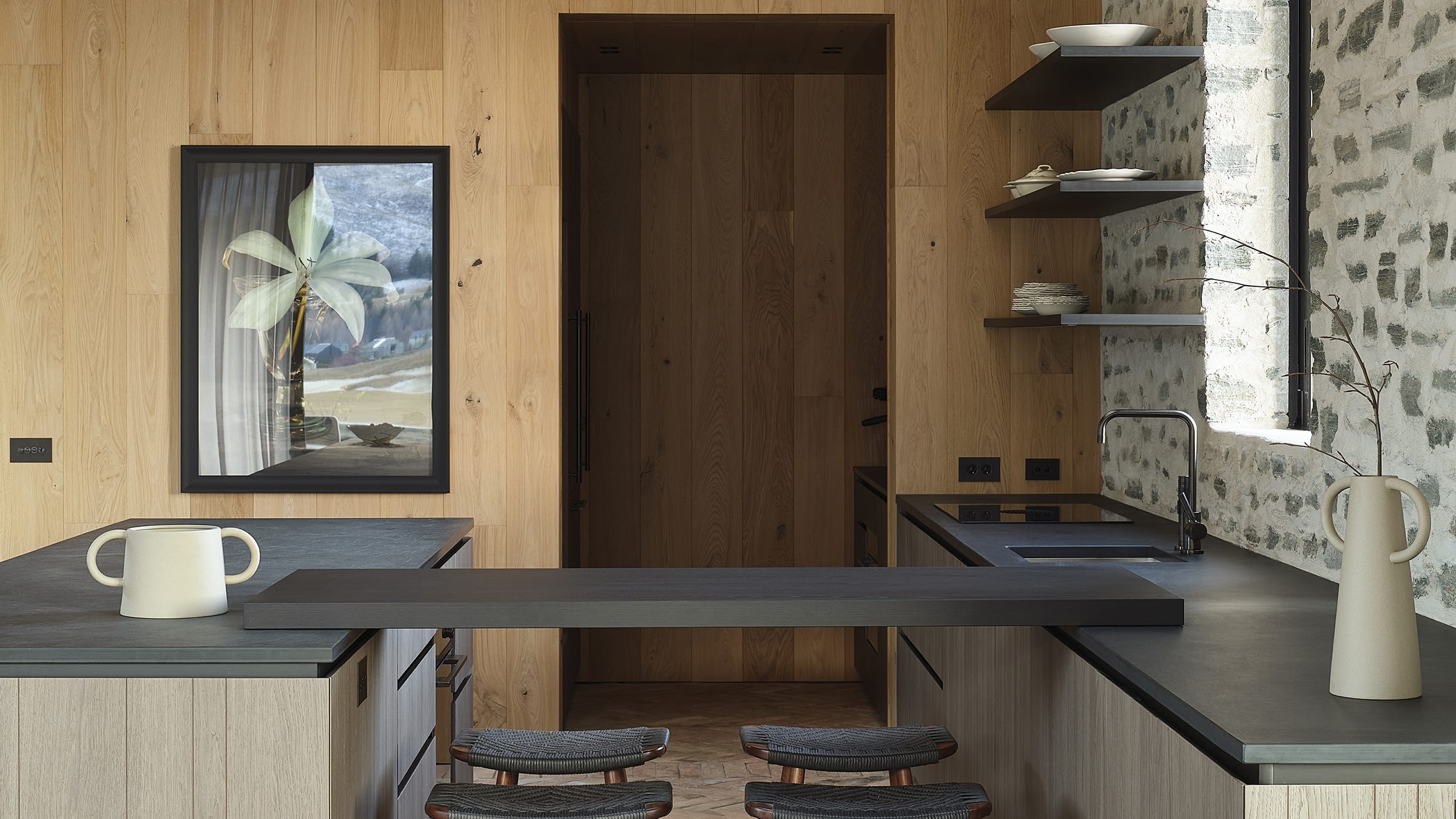 The main living area is anchored by a Poliform kitchen. Designed for entertaining, with multiple work zones and no overhead cabinetry, it is a highly functional space that feels airy and generous. A breakfast bar links the island and back benches, creating the perfect gravitational point for morning coffee. The hidden scullery is located behind a timber sliding door and easily accessible from the kitchen's primary work zone, ensuring the visible work areas stay clutter-free.